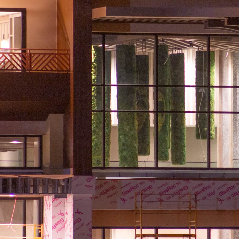 Another view of the lobby shows us that the carved wooden pillars appear complete. For now they are being protected from other work projects in the area. Once again in the concept image, we can see that an abundance of natural light is a large part of this hotel’s design.